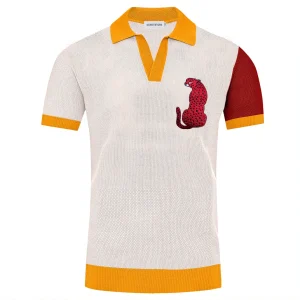 Men’s Retro Arch Print Knit Shirt – Multicolor Button-Up Polo in Cream