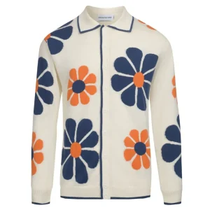 Men’s Retro Floral Knit Cardigan – Cream with Orange and Navy Flowers