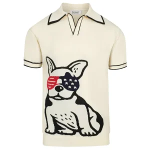 Men’s Retro Knit Polo – Vintage Cream Button-Up with Bulldog Graphic