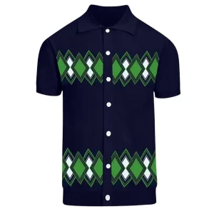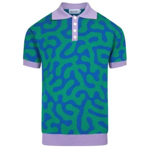 Men’s Abstract Squiggle Knit Polo – 80s-Inspired Green and Blue Shirt