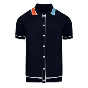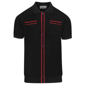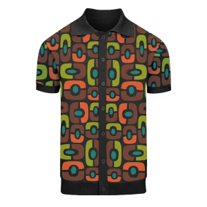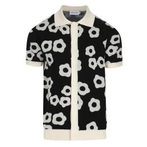 Men’s Black & Cream Retro Flower Knit Polo – 60s Mod Button-Up Shirt
