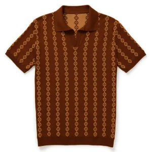Men’s 70s Retro Knit Polo – Rust Orange Geometric Short Sleeve Shirt