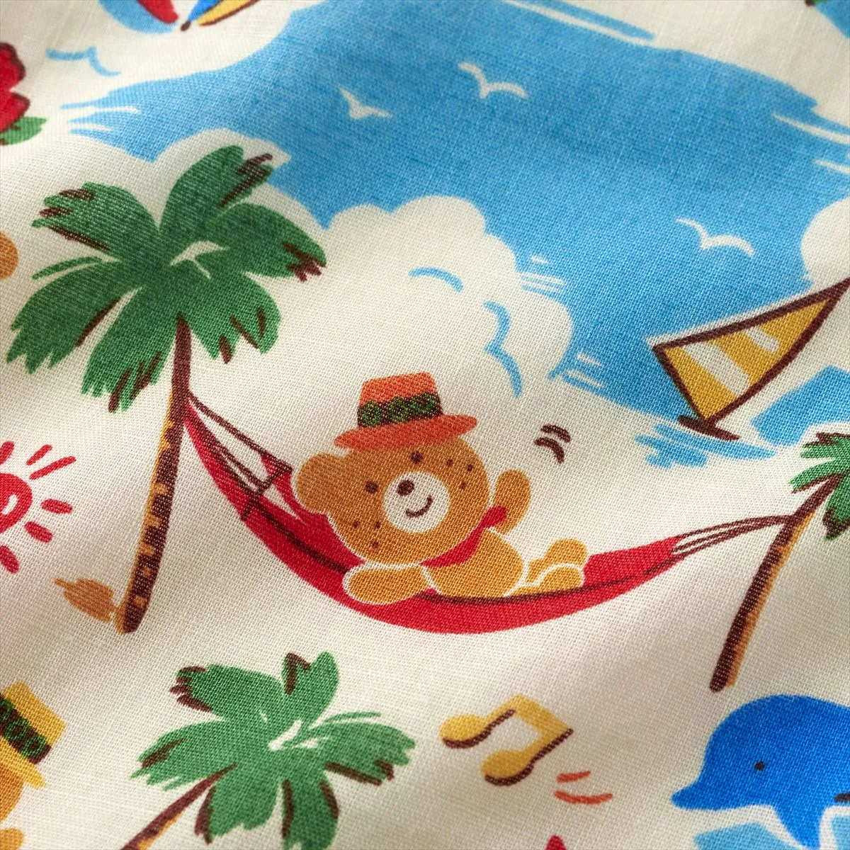 Say aloha to this tropical summer look to take on every getaway from the Aloha Print Collection. Beans the Bear leisurely unwinds in the exclusive summer print, lounging in a hammock, jamming on his ukelele, and catching waves on his surfboard. This Hawaiian shirt is crafted in a heavenly breathable, sweat-absorbent, wrinkle-resistant cotton linen fabric that is both smooth and cool to the touch. Just throw it on for instant vacation mode.