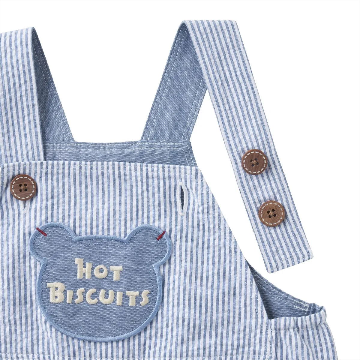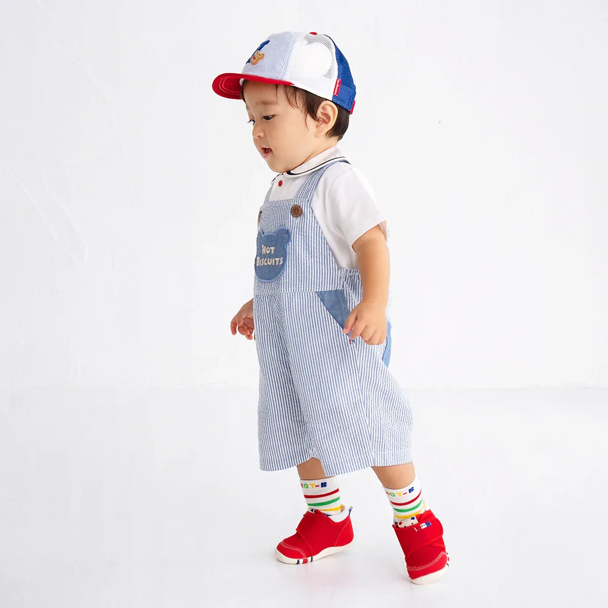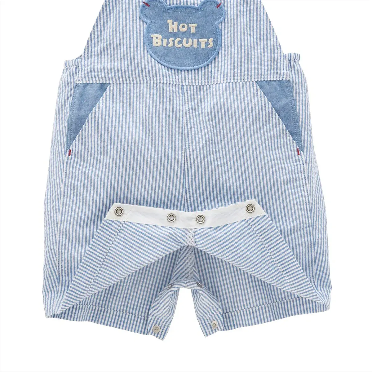 Keep cool in refreshing gradients of breezy blue stripes. These blissfully breathable knee-length overalls feature bear-shaped motifs on both the front and back with touches of dungaree detailing. The shoulder straps are adjustable to two lengths with buttons for longer wear. Discover the ultimate summer twin look with the jumper dress from the same collection.