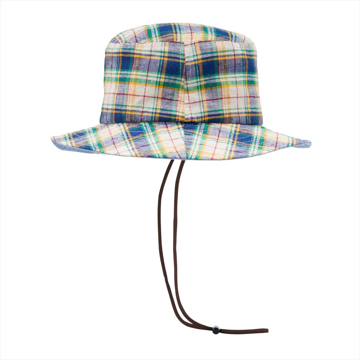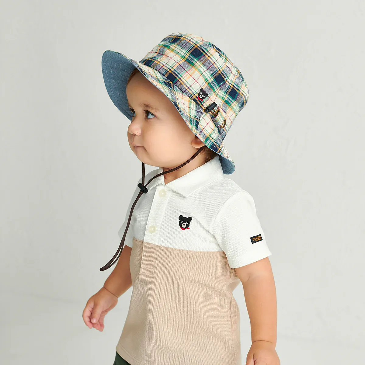 Meet us outside in this bucket hat, perfect for spontaneous sun-safe fun on family getaways, school trips, and outdoor discoveries. The size-adjustable drawstring detaches whenever pulled on for added safety. Expertly crafted in plaid cotton linen perfect for spring to fall, B_Bear subtle presence ensures unwavering style.