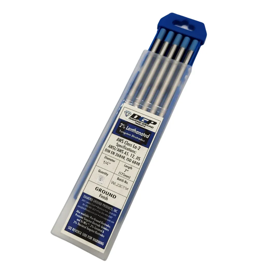 2% Lanthanated tungsten is one of the best general purpose electrodes. Suitable for both Alternating Current (A/C) or Direct Current (D/C) using inverter or transformer based constant current power sources. It is good for low-alloyed steels, non corroding steels, aluminum alloys, magnesium alloys, titanium alloys, nickel alloys, copper alloys and is typically our recommendation if you are purchasing your first package of tungsten electrodes.
