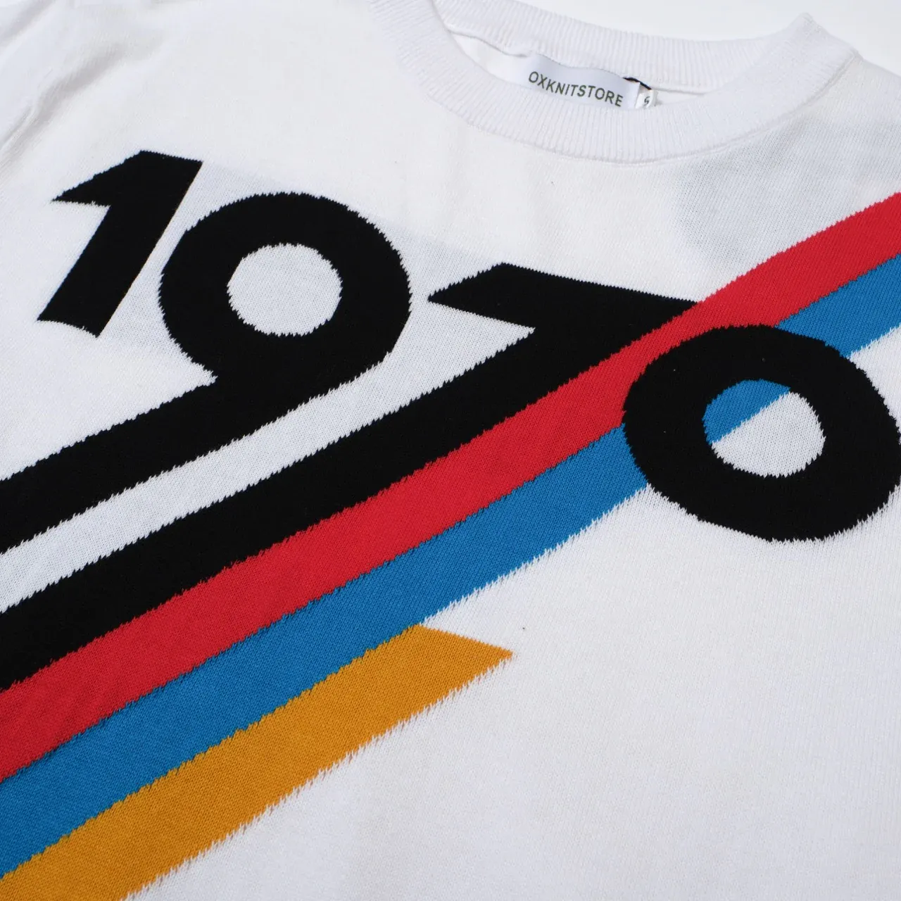 Men’s 1970 Retro Graphic Knit Tee – White with Racing Stripes