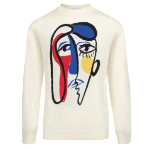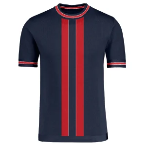Inspired by 60s British mod fashion, this men’s knit sweater blends minimalist design with athletic edge. Made in a rich cream tone, it’s elevated by two vertical racing stripes in navy and red that run from the shoulder down the chest – subtle yet striking.