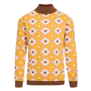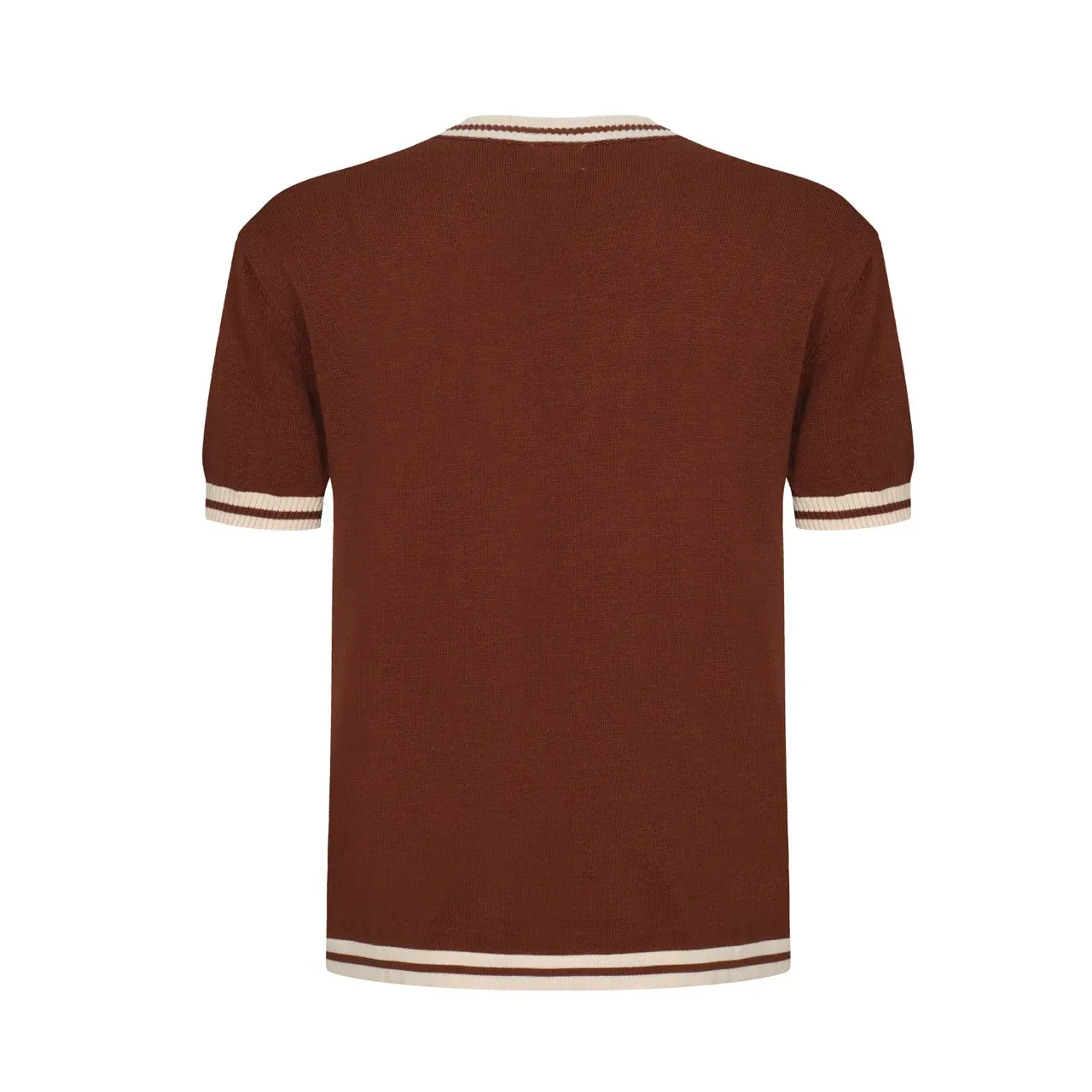 This knit tee revives a golden era of bold design, featuring vertical racing stripes in cream, goldenrod, and orange on a deep cocoa brown canvas. With a crew neckline and ribbed cuffs, it combines retro sport vibes with mod minimalism.