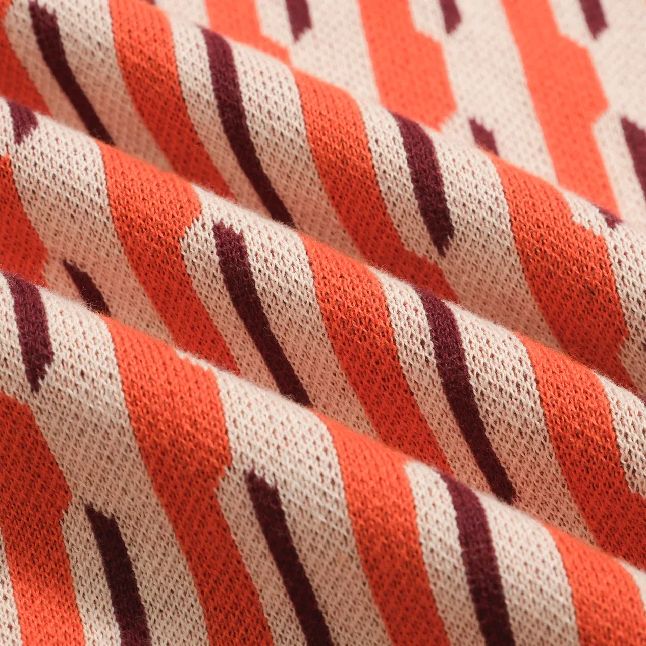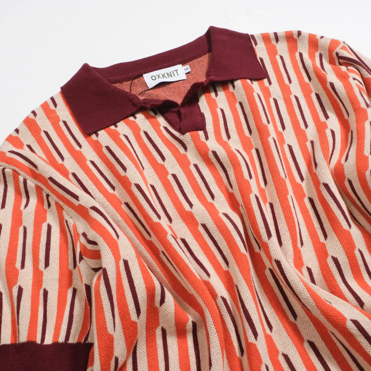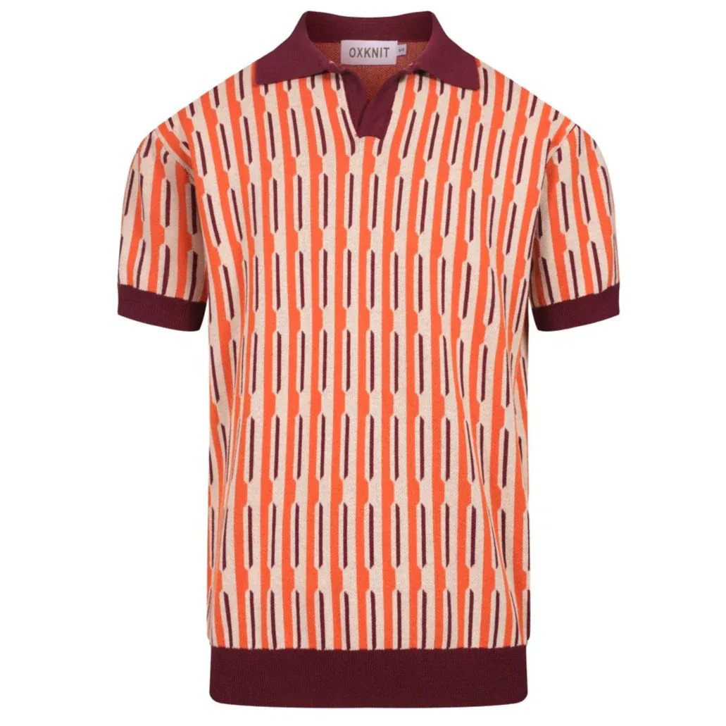 With a rich palette of burnt orange, tan, and chocolate brown, this jacquard knit polo brings serious 70s attitude to your rotation. The vertical dash pattern plays with depth and dimension, while the open collar neckline adds a touch of laid-back mod charm.