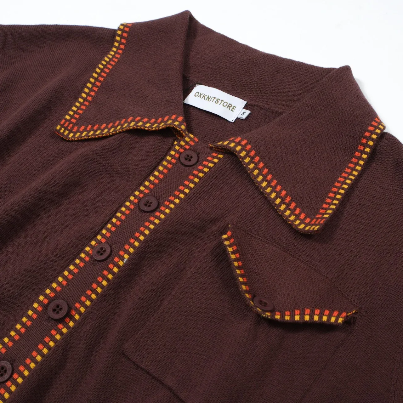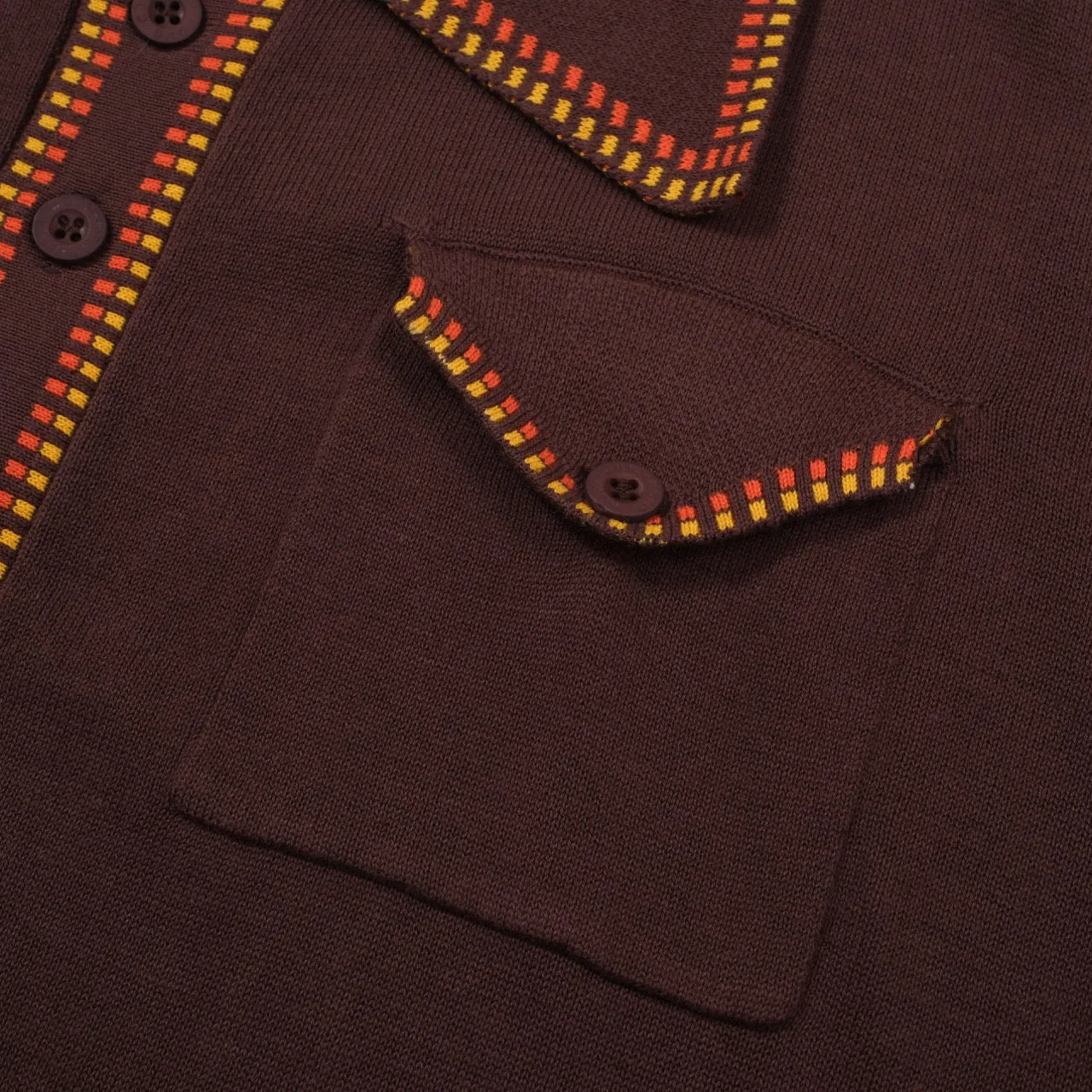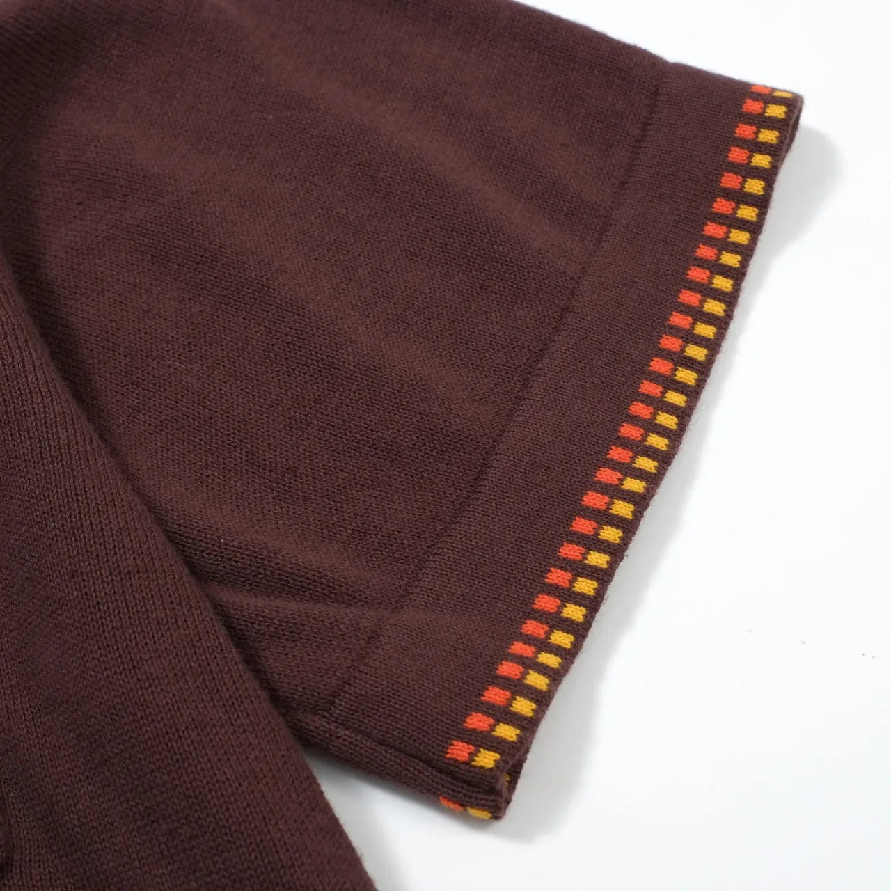 Step into that unmistakable 70s energy with this standout Mod-style knit shirt. The deep chocolate brown base sets the tone, while the yellow and red checkerboard trim electrifies the edges—from the pointed collar and cuffs to the button placket and chest pocket flap.