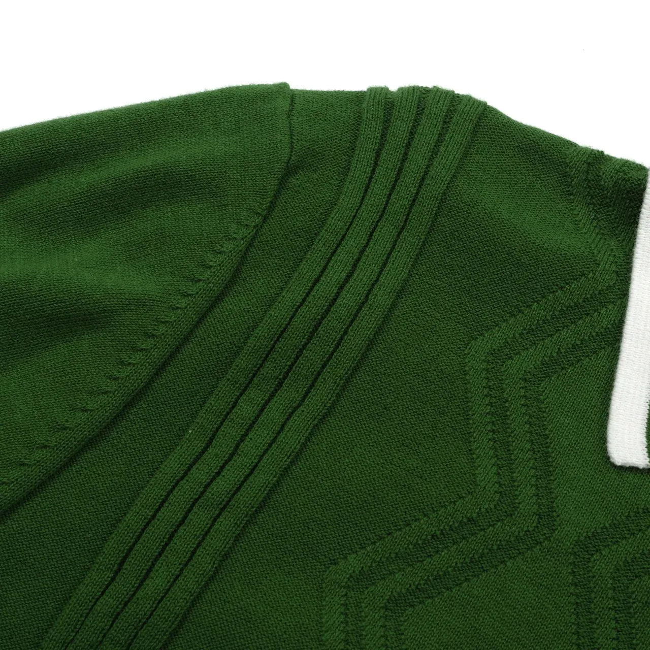 Clean, crisp, and effortlessly cool—this cable knit polo channels the essence of 60s mod menswear. The deep green hue is accented by white twin stripes on the collar, sleeves, and hem, bringing a preppy twist to its retro silhouette. Wavy knit textures down the front give this shirt subtle dimension and a tailored, polished feel.