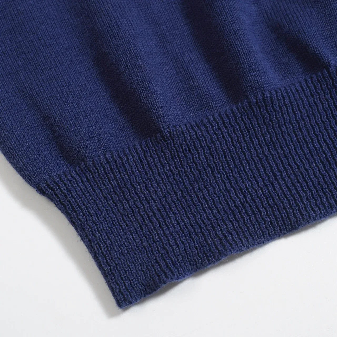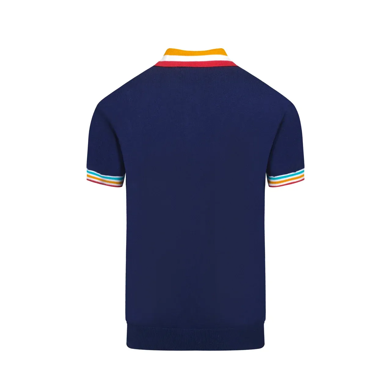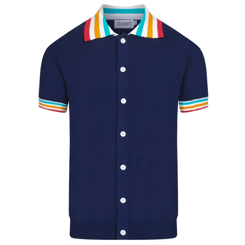 Men’s Navy Knit Polo Shirt – Rainbow Trim 60s Mod Button-Up