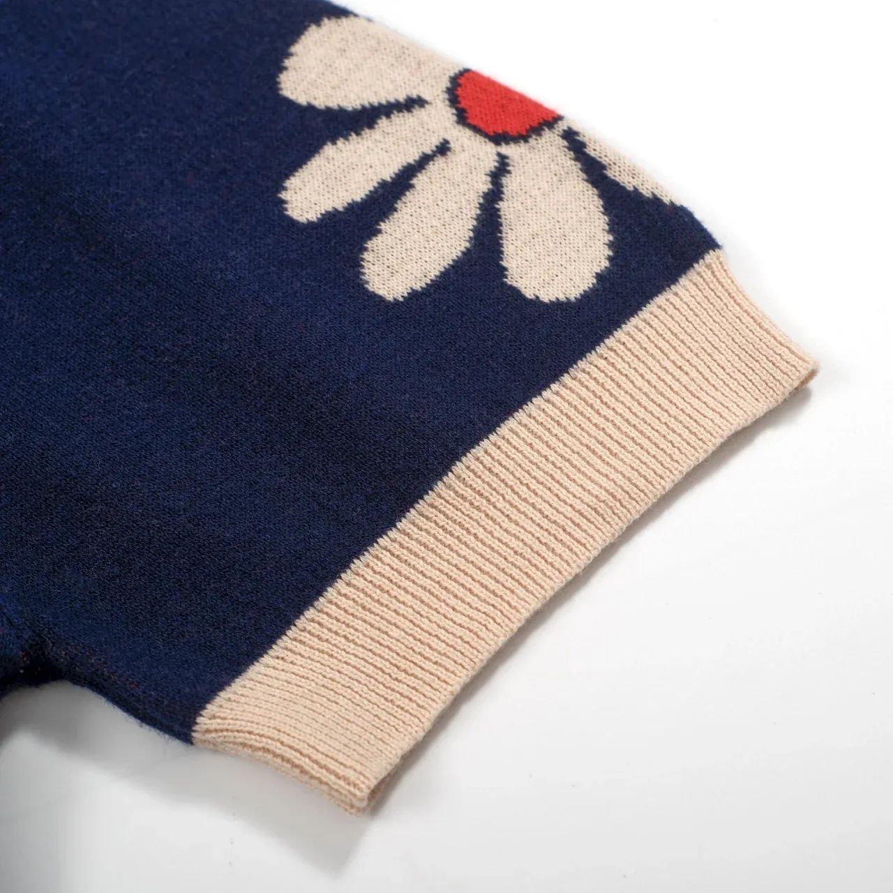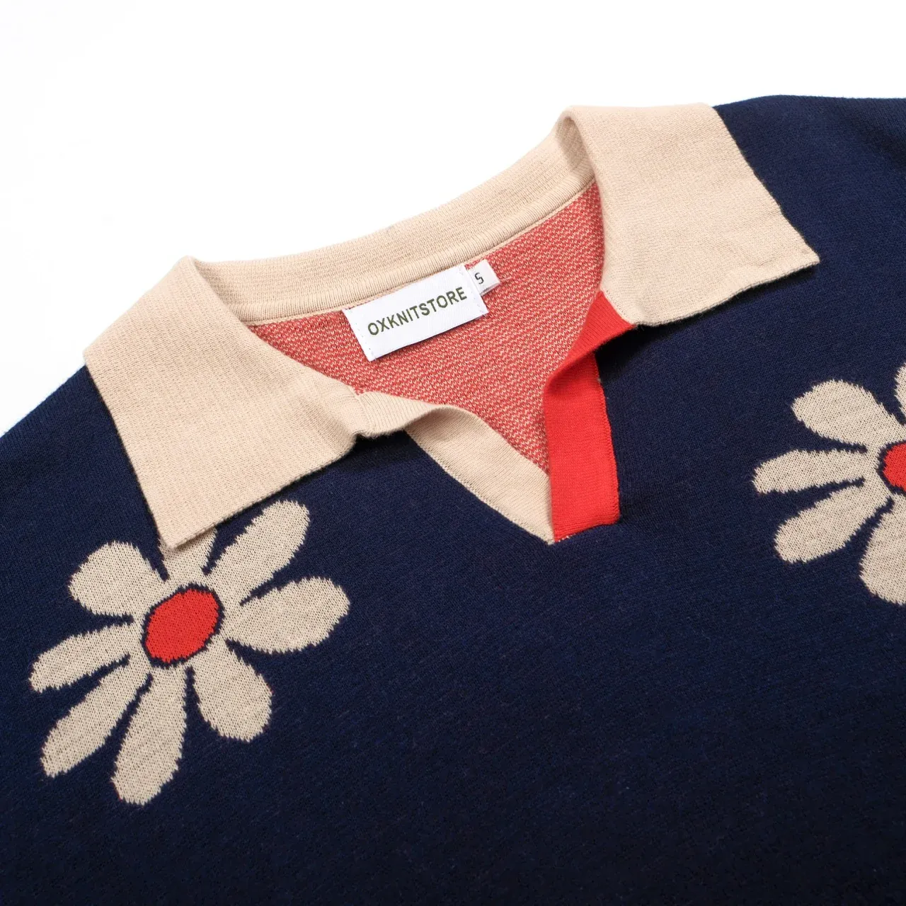 Embrace the flower-powered energy of the 1970s with this men’s retro knit polo shirt. Set against a deep navy base, the all-over daisy pattern brings playful vintage flair, while the cream collar and cuffs add a classic contrast. A bold red accent at the neckline completes the look, making this piece a true statement for anyone who loves standout retro style.