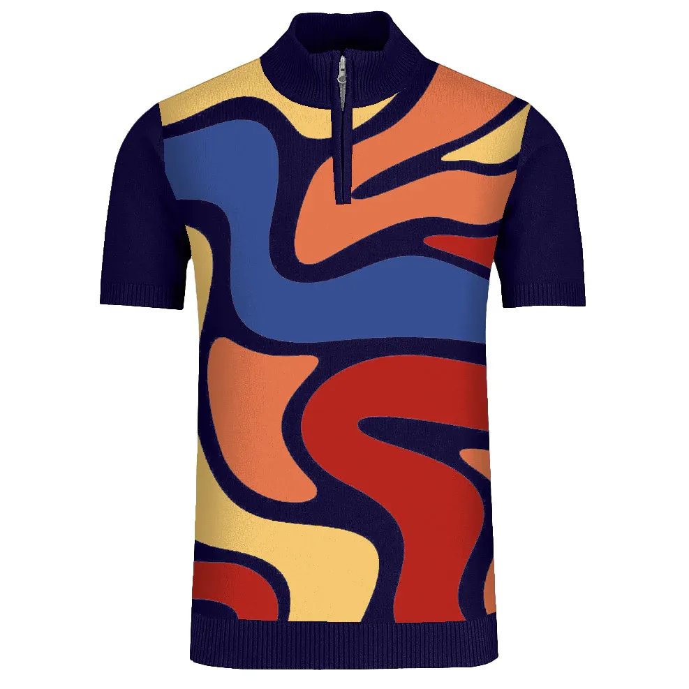 This knit zip polo takes you straight to the psychedelic pulse of the 1970s. With sweeping swirls of burnt orange, navy, sunshine yellow, and cobalt blue, the shirt evokes the era’s electric spirit. The high collar with a functional front zip adds sporty edge and a touch of mod revival.