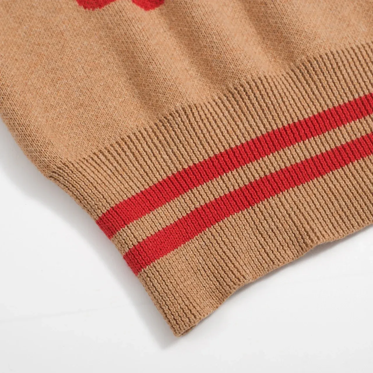 Red stripe accents on the collar, cuffs, and hem add just enough contrast while keeping the silhouette clean and wearable. Whether layered under a jacket or worn solo, this sweater brings texture, charm, and serious vintage attitude.
