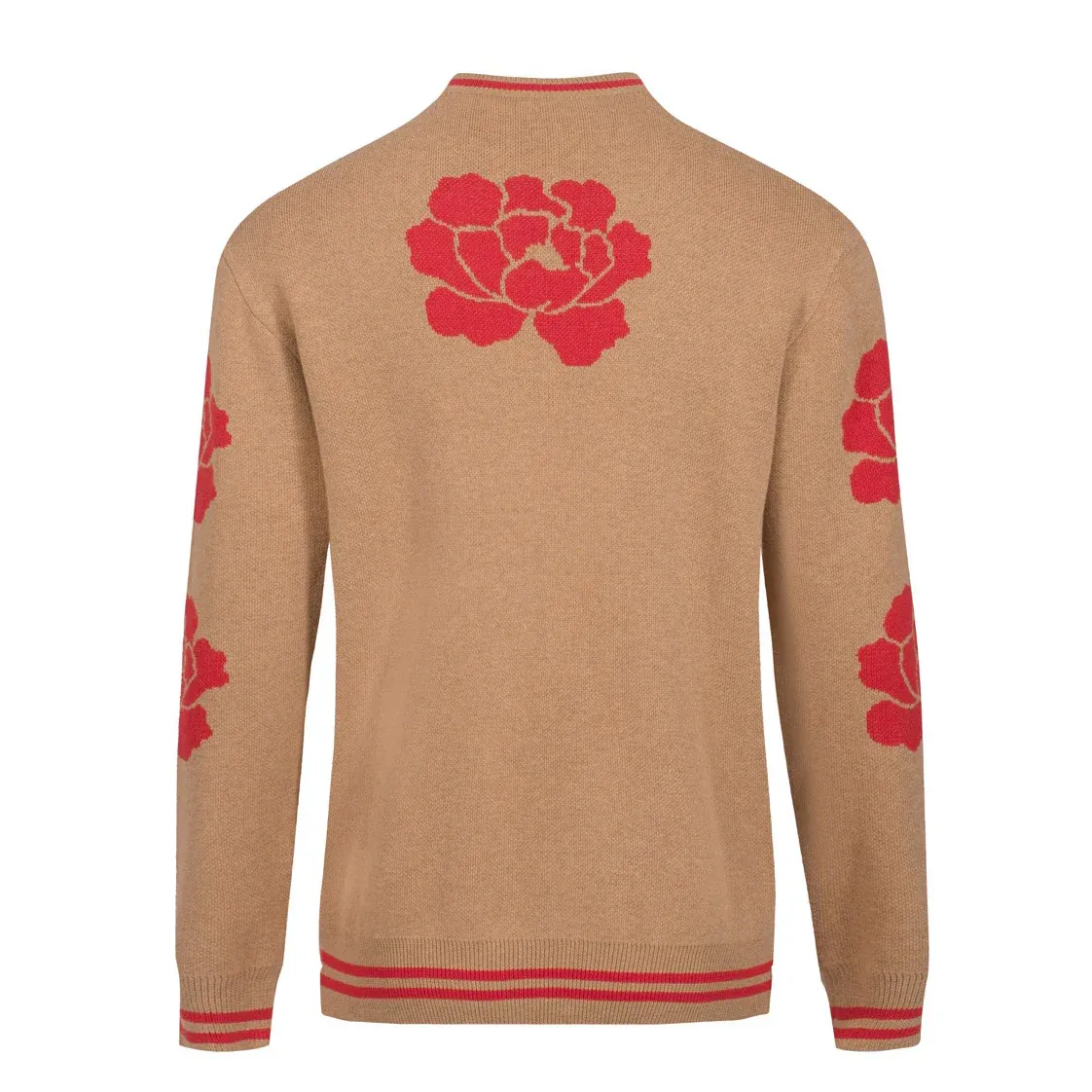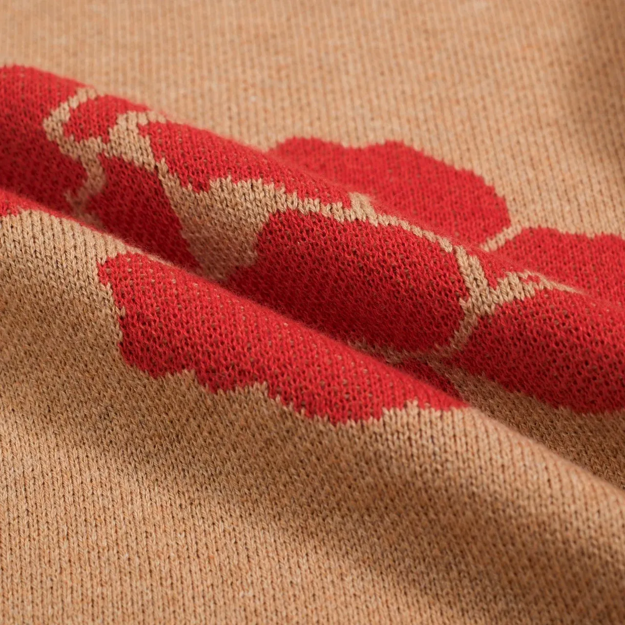 This men’s floral knit pullover turns heads with a playful vintage twist. Featuring oversized red jacquard flowers scattered across a warm camel backdrop, the design feels lifted from 1970s wallpaper or retro upholstery—bold, unapologetic, and deeply nostalgic.