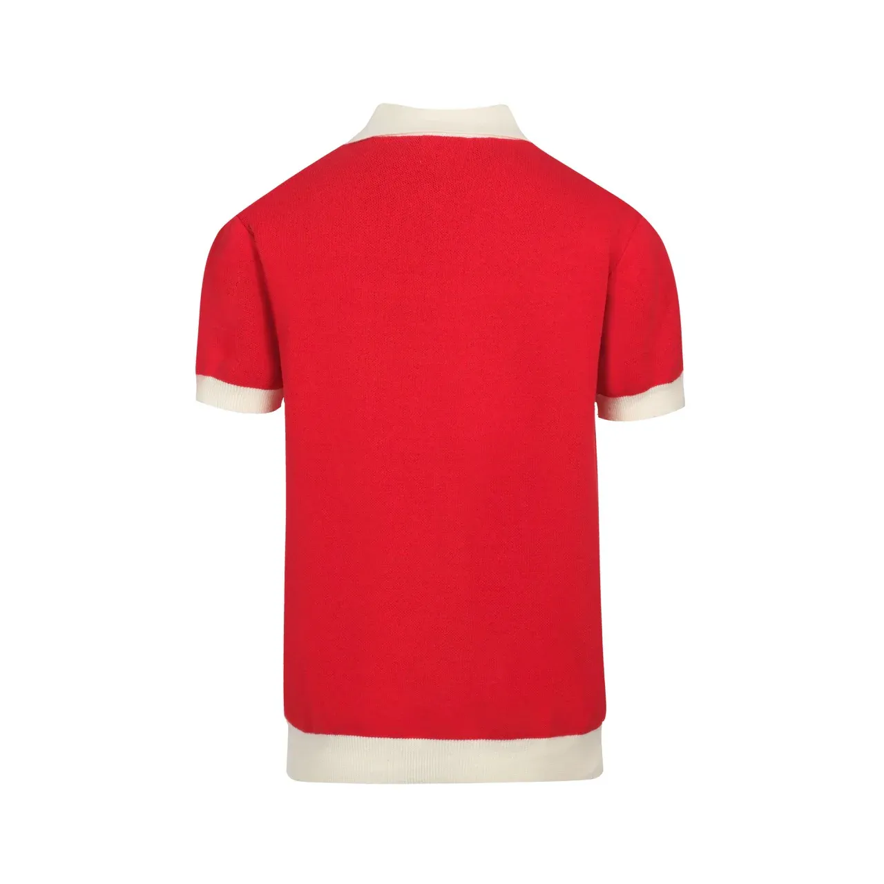 Unleash your retro spirit with this bold men’s knit polo shirt featuring striking vintage tiger graphics. The vibrant red backdrop is complemented by crisp, cream-colored trims and classic button-up styling, capturing the adventurous spirit of vintage fashion from the 60s and 70s. Crafted from soft knit fabric, it offers comfort without compromising on boldness.