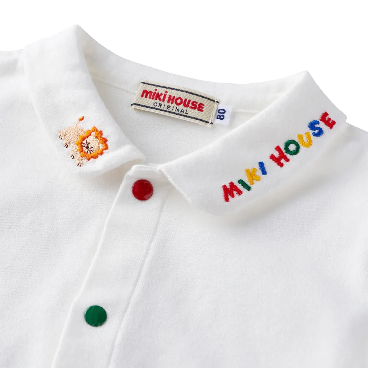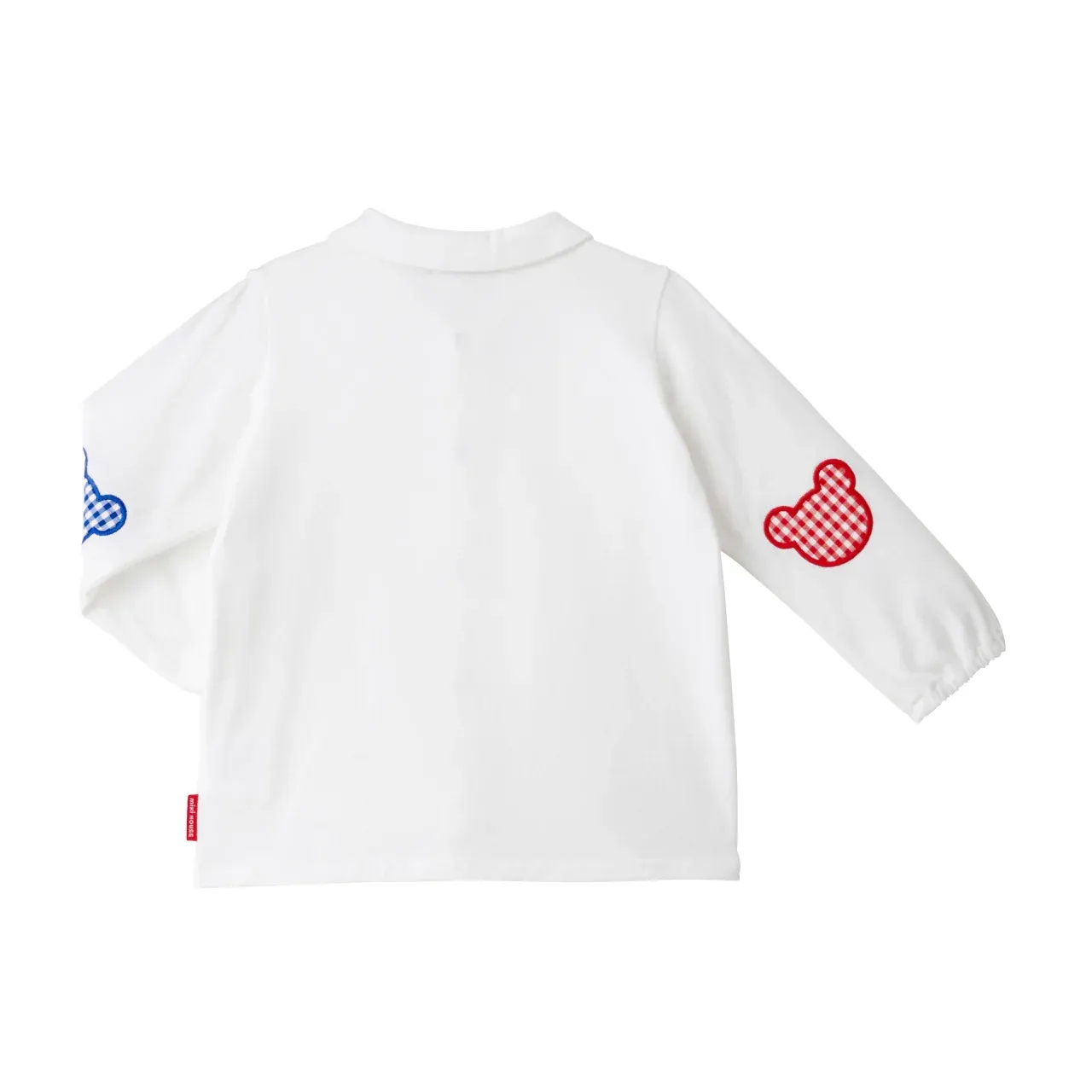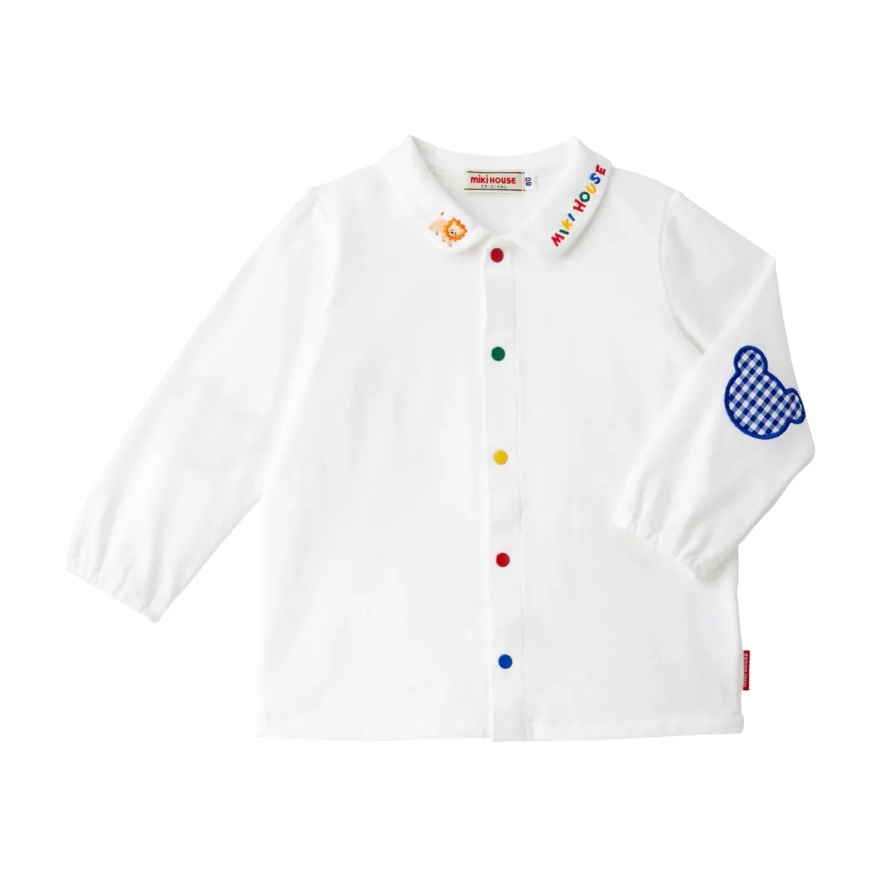 No matter the occasion, this long sleeve button down will never disappoint!! The club-style collar with an adorable lion embroidery and our colorful MIKI HOUSE logo is just the beginning; gingham bear elbow patches in signature MIKI HOUSE colors and colorful snap-closure buttons add accents that make this shirt like none other. The elastic sleeve cuffs allow for a snug fit, and the 100% gentle cotton material provides ultimate breathability and comfort. This button down is a must have!