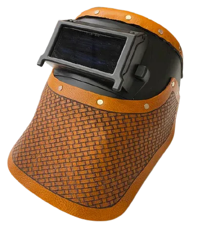New Outlaw welding hoods thermoplastic flip front welding hood with saddle tan basket weave top and bottom bib. Includes new Outlaw comfort headgear.