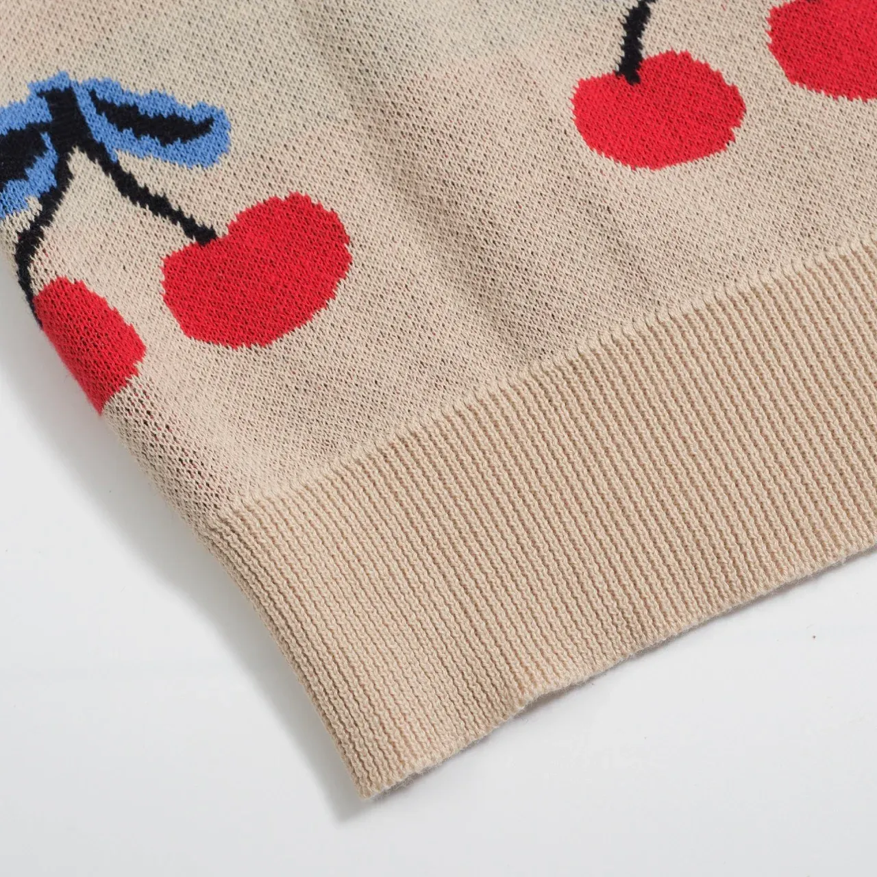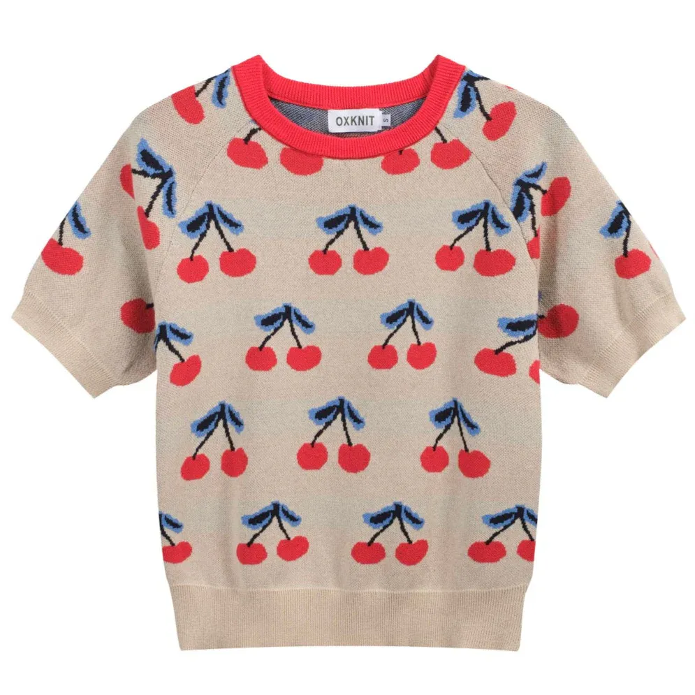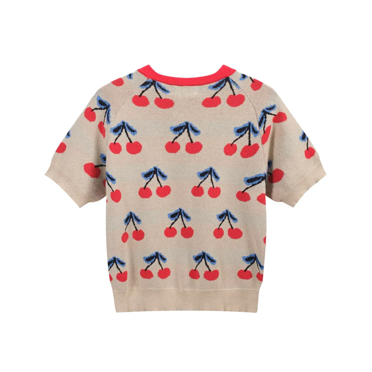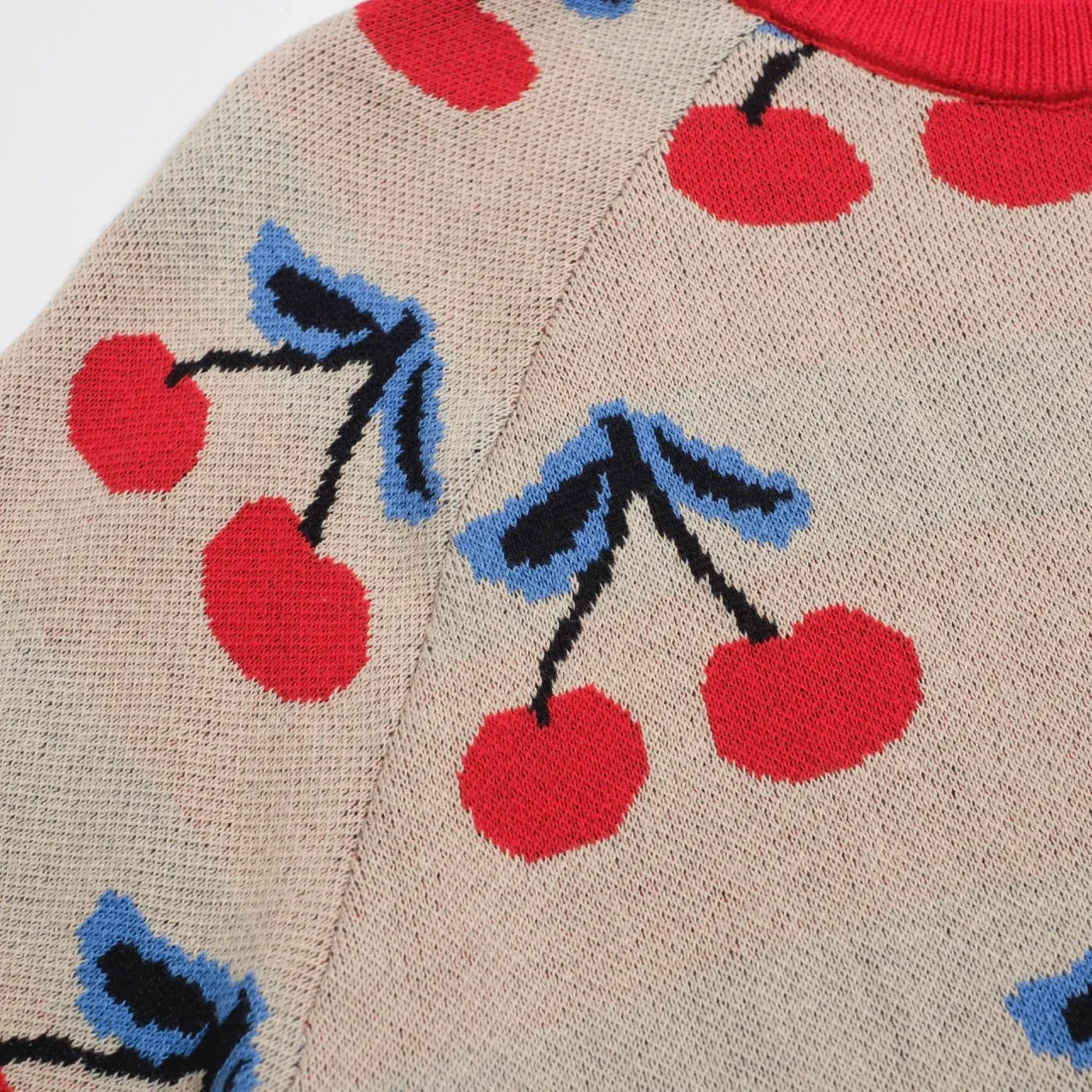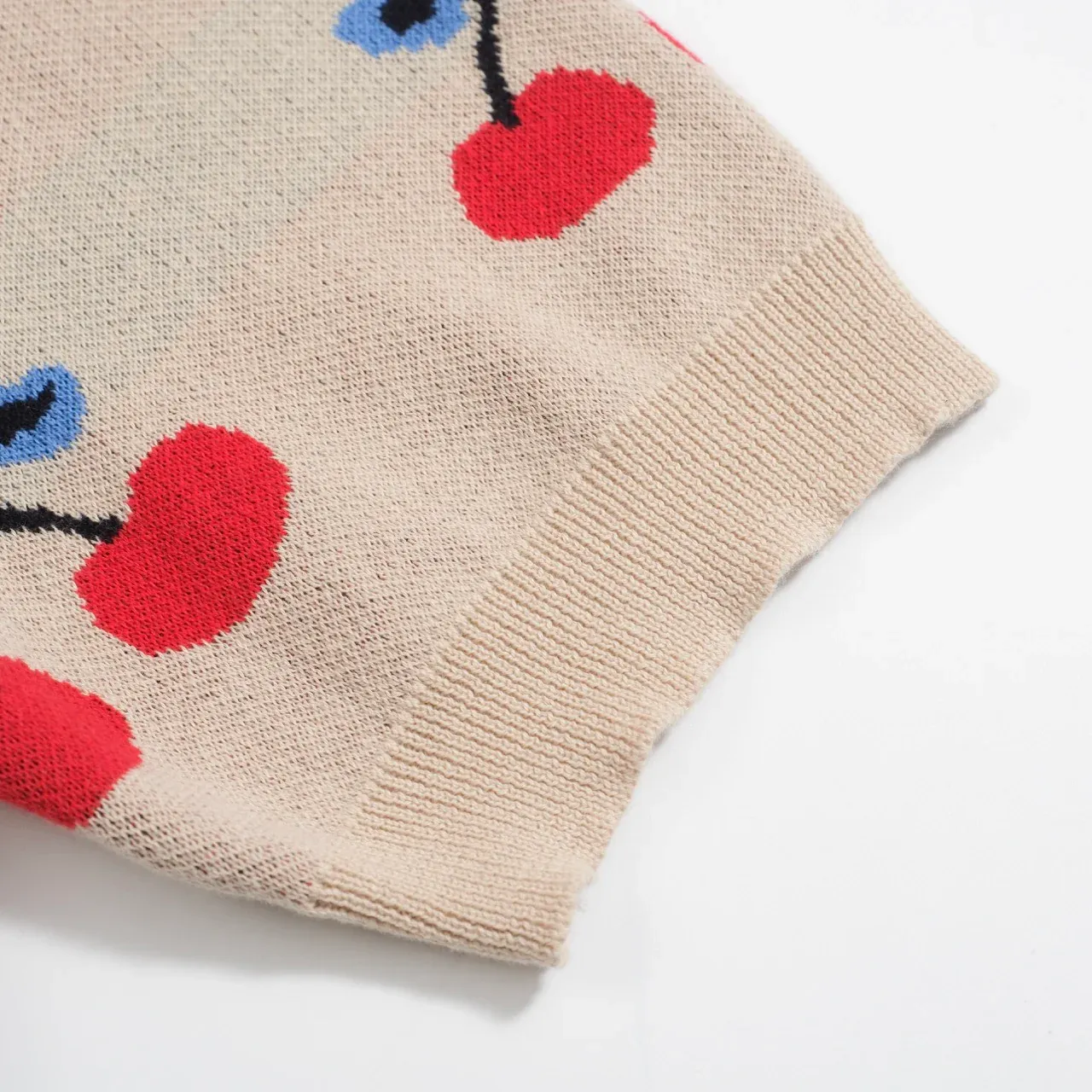 Bring on the sweet nostalgia with this 1970s-inspired cherry knit tee. Set against a warm beige background, the all-over cherry motif pops in vivid red with painterly navy stems, giving it a charming hand-drawn feel.