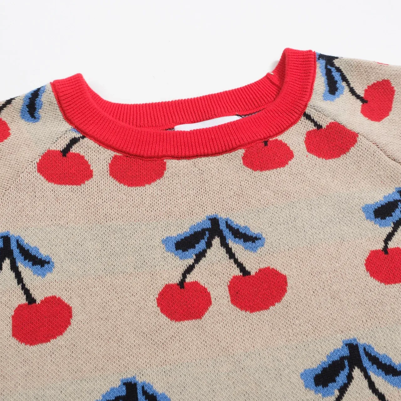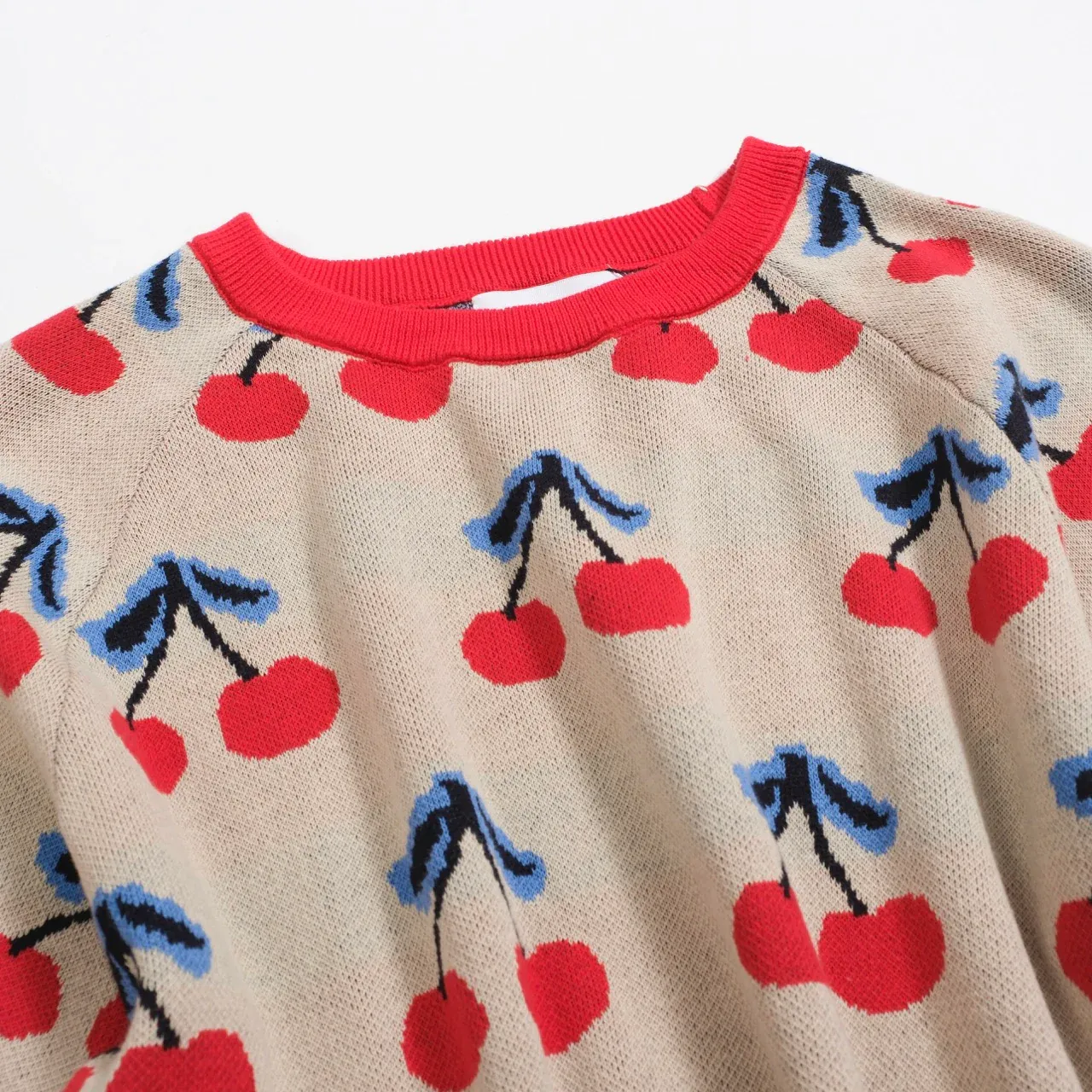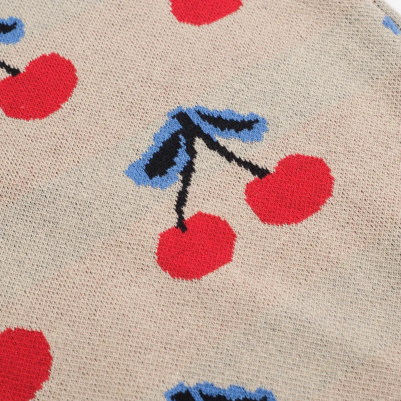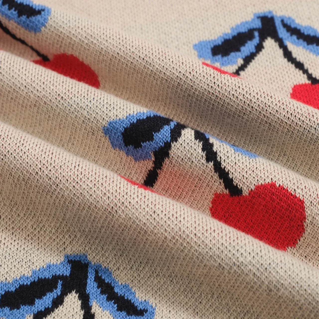 Bring on the sweet nostalgia with this 1970s-inspired cherry knit tee. Set against a warm beige background, the all-over cherry motif pops in vivid red with painterly navy stems, giving it a charming hand-drawn feel.