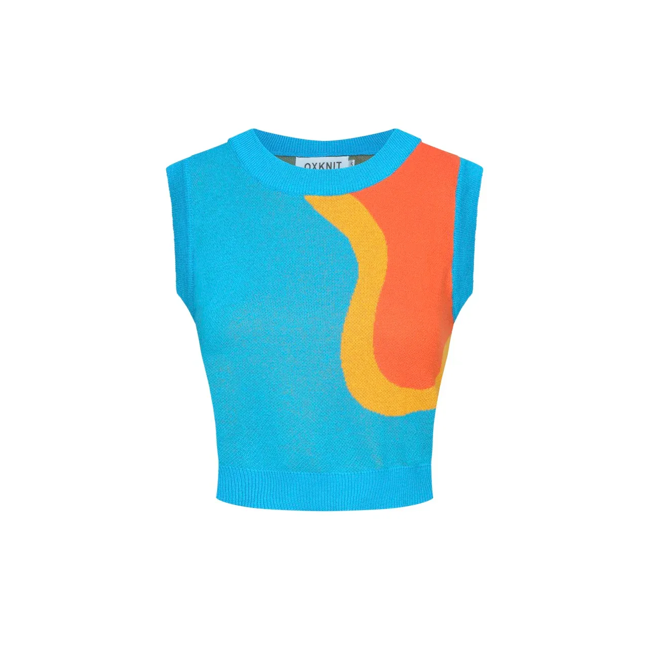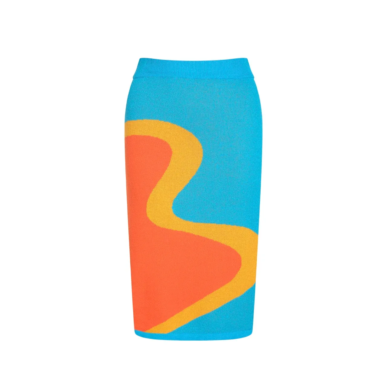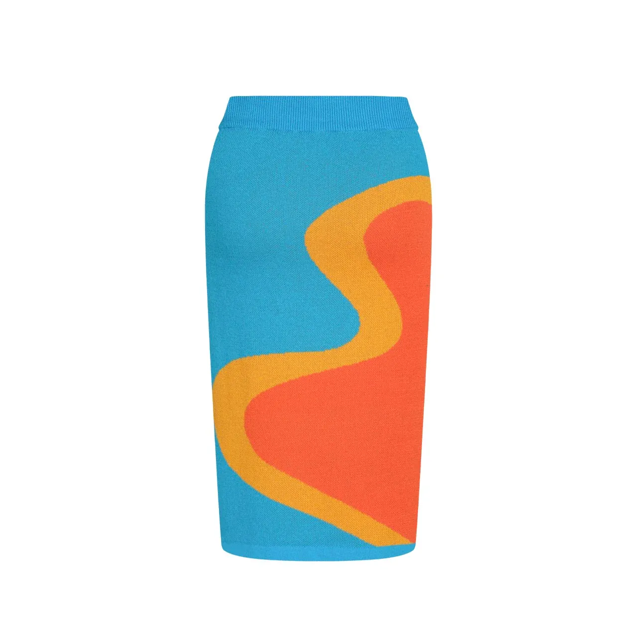 This eye-catching blue and orange graphic knit set features an abstract design that’s both bold and playful. The crop top showcases an asymmetrical design with bright orange curves against a vibrant blue background, while the pencil skirt mirrors the same bold pattern. The contrasting ribbed details add structure to the design, making it a stylish and comfortable outfit for any occasion.
