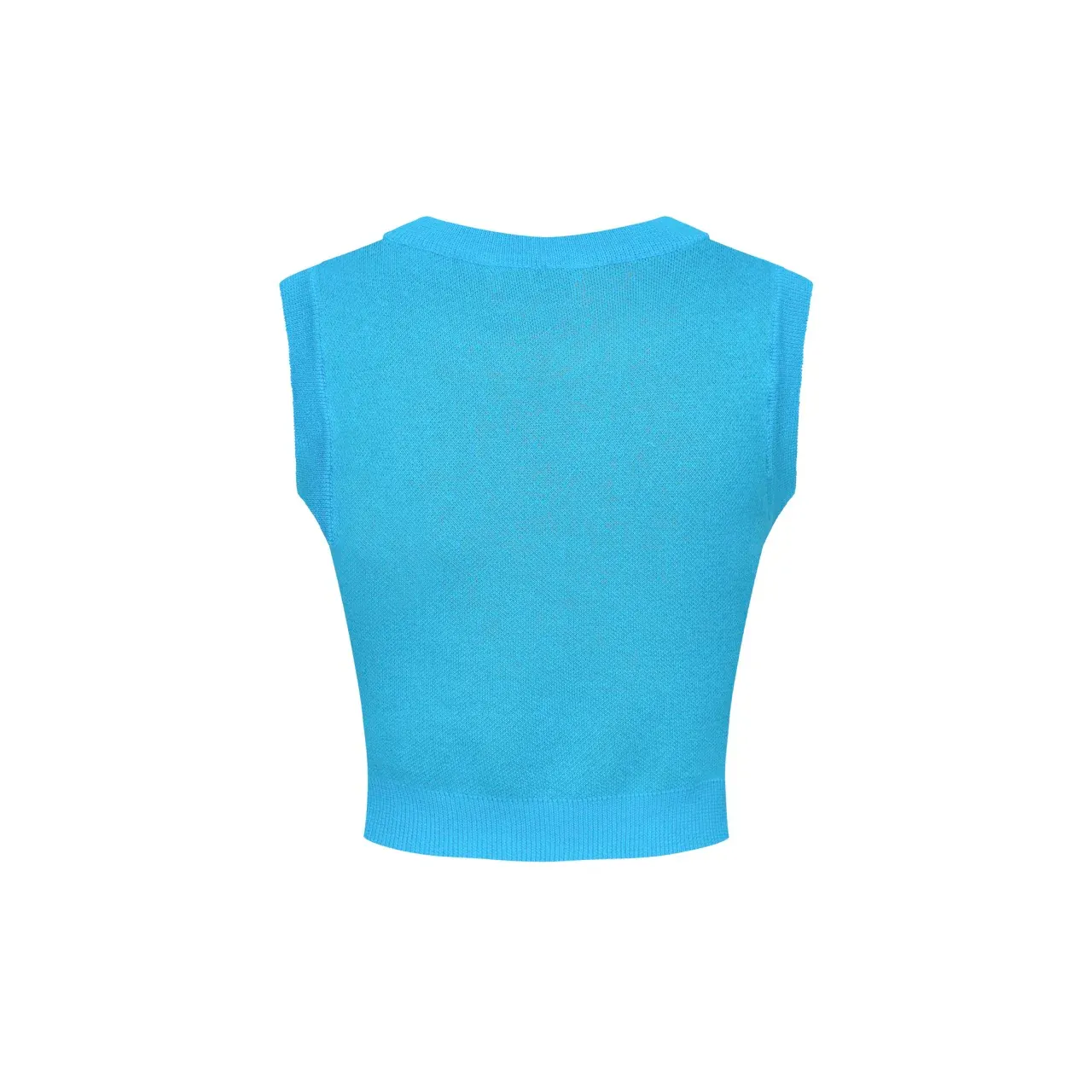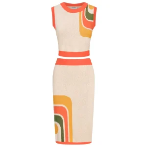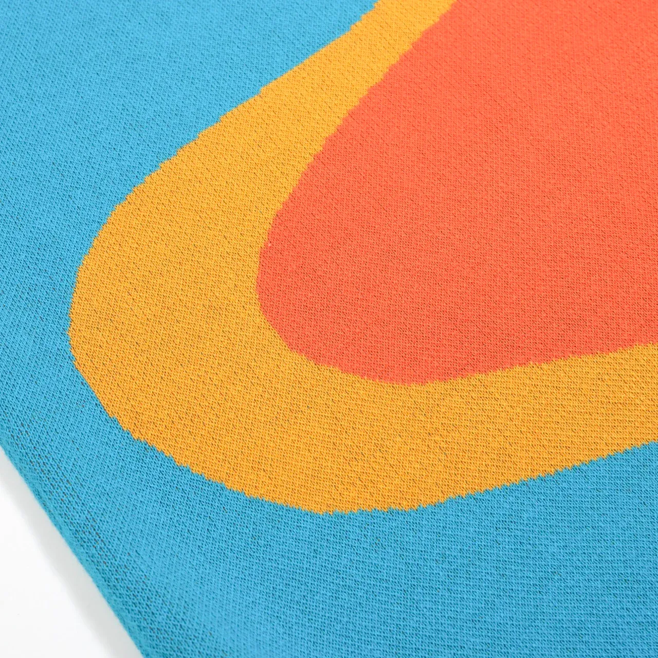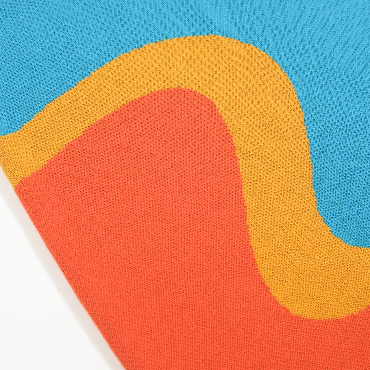 This eye-catching blue and orange graphic knit set features an abstract design that’s both bold and playful. The crop top showcases an asymmetrical design with bright orange curves against a vibrant blue background, while the pencil skirt mirrors the same bold pattern. The contrasting ribbed details add structure to the design, making it a stylish and comfortable outfit for any occasion.