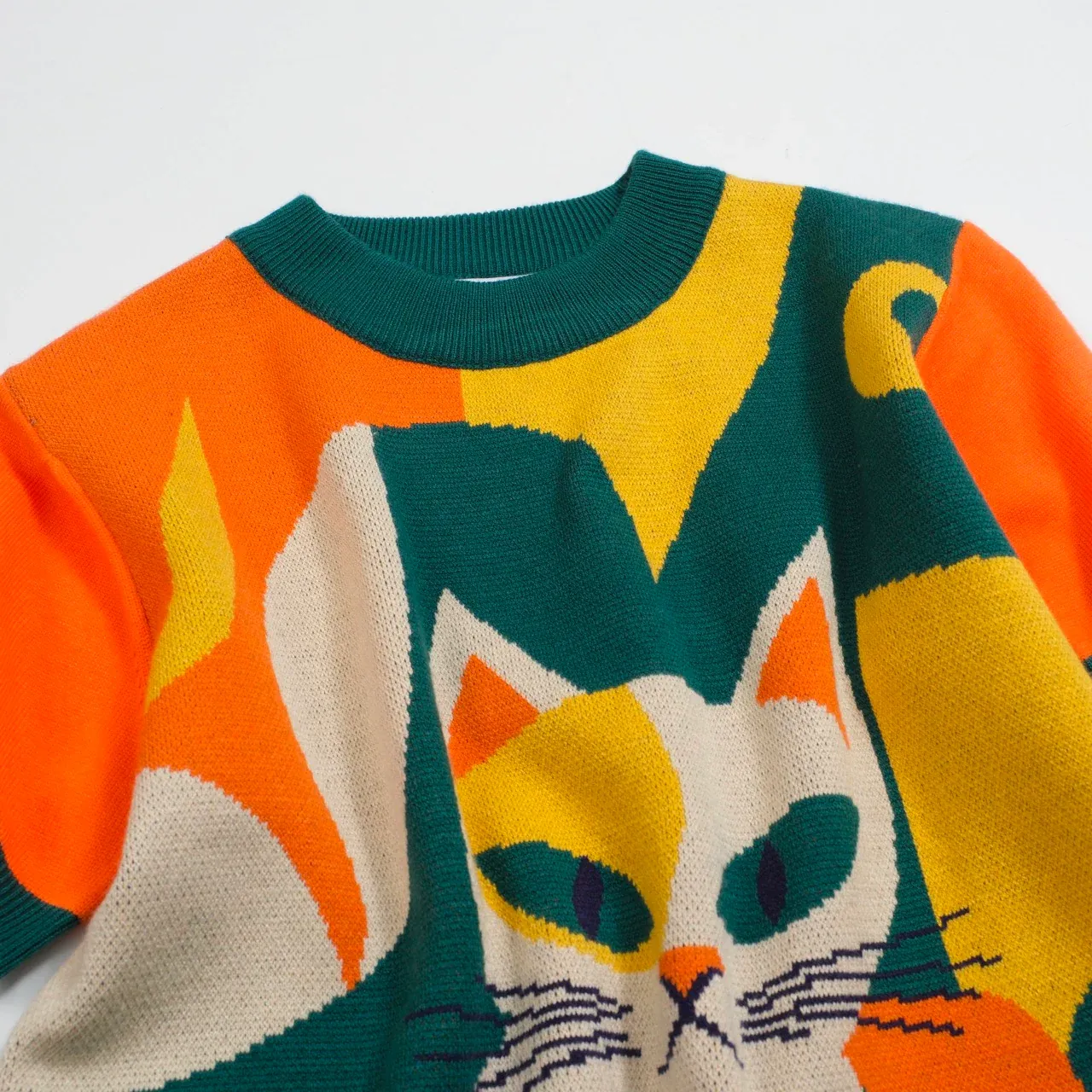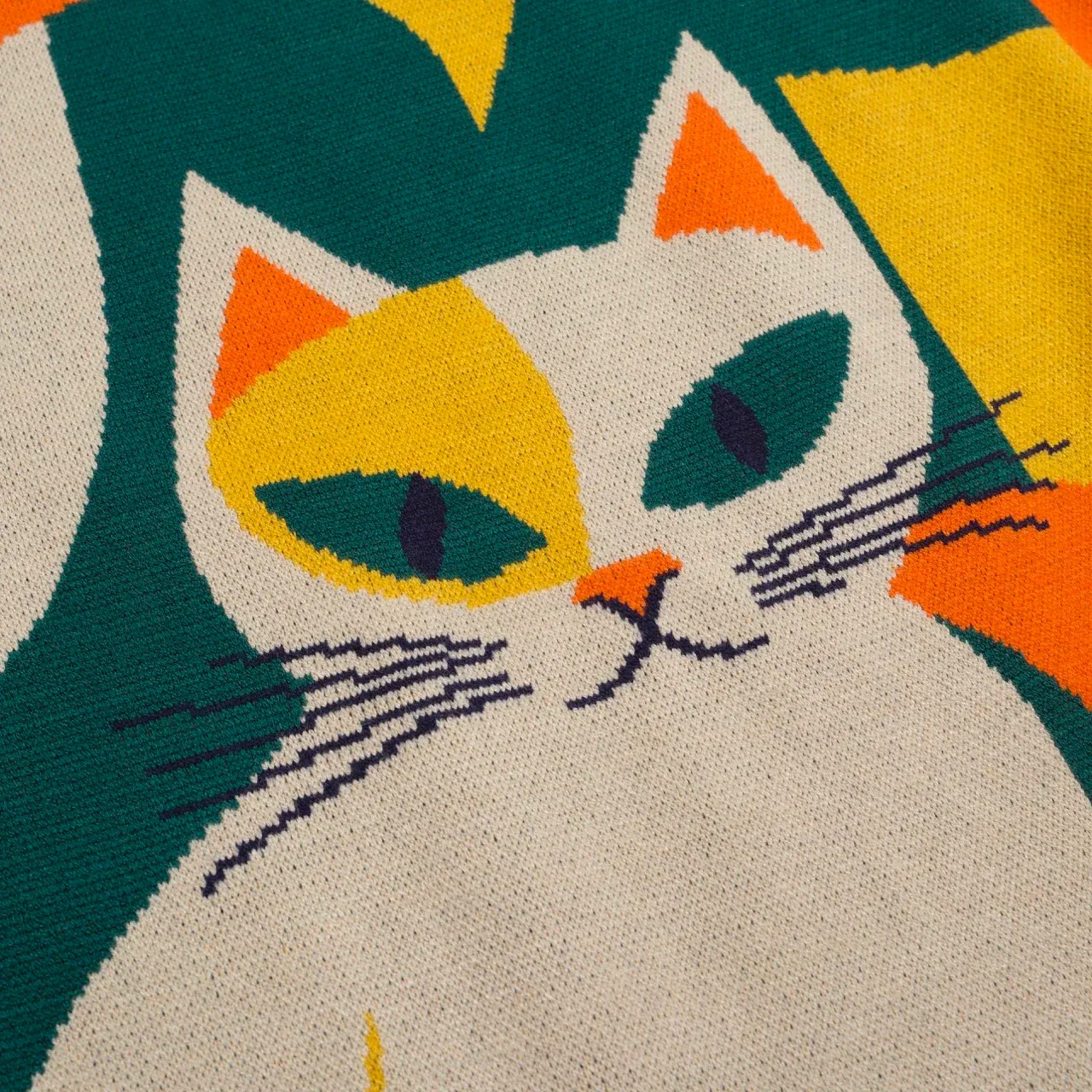 The colorblock palette pops with energy, while the soft, stretchy knit hugs comfortably without clinging. Whether you’re a cat lover, a design aficionado, or just someone who wants their outfit to spark joy—this top brings all the personality.
