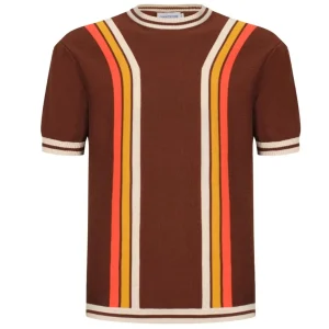 Men’s 70s Brown Knit Tee – Retro Racing Stripe Shirt