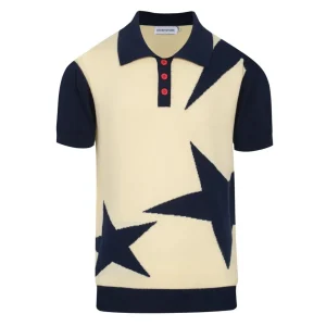 Men’s 60s Star Print Knit Polo Shirt – Navy & Cream Retro Mod Style