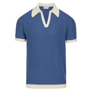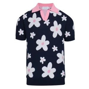 Men’s 70s Navy Daisy Knit Polo – Retro Pink Collar