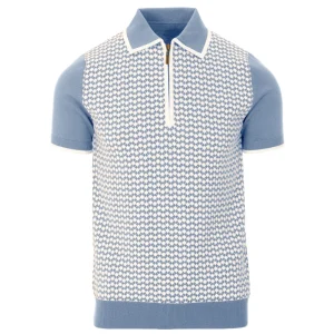 Men’s 70s Mod Zip Knit Polo – Light Blue Diamond Pattern Summer Shirt